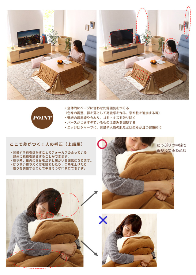 商品よりは時間をかけず、 手早く 商品がより美しく見えるように人物の補正も行っていました。
