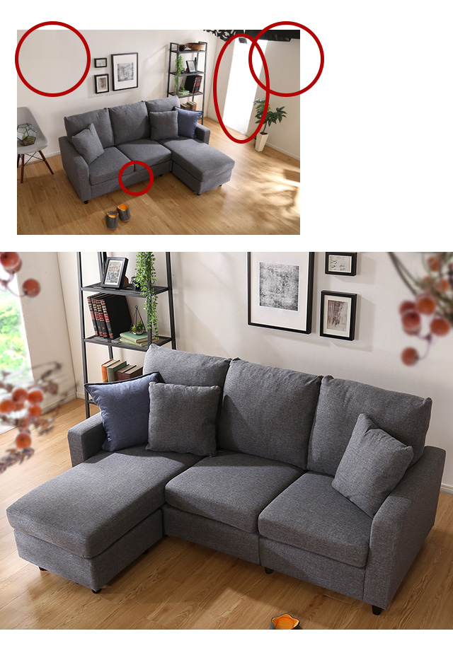 商品がホワイトなら背景に色を付けることでコントラストを出したり、モール内での商品検索時に表示されるカゴ横をより目につきやすくしていました。さらに、最近では海外のような大胆なカラーリングを取り入れたインテリアも注目していることからコーディネート提案として一部の写真に補正を加えることもありました。